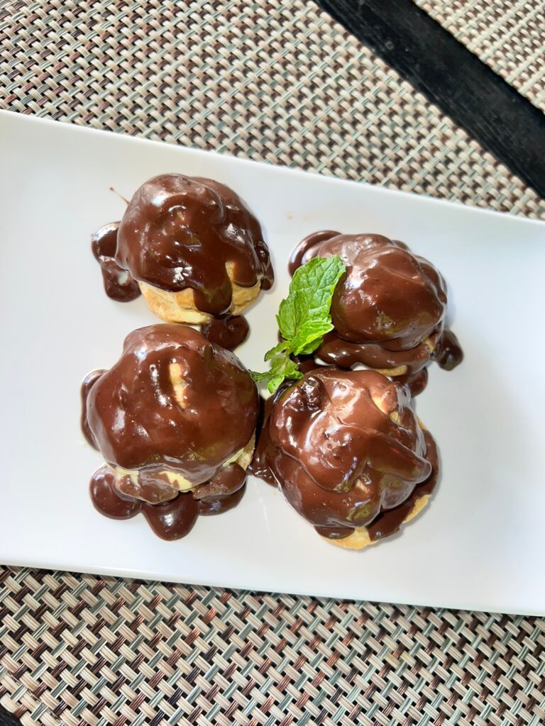 Agora que falamos dos pratos principais, também apresento o que vocês podem pedir no executivo de entrada, uma salada orgânica com molho Peccato ou uma brusqueta e para fechar a sobremesa profiteroles com chocolate alpino ou sorvete com calda quente.
