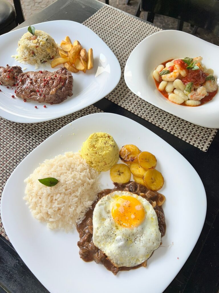 Dentre as diversas opções de pratos principais tem o picadinho com ovo frito e gema mole acompanhado de arroz, farofa e banana frita, para quem gosta de massa o Gnhocci à Dorival Caymmi vem com camarão e molho pomodori pelati e com tempero de ervas da Bahia e pros amantes de uma boa carne tem o ancho acompanhado com arroz biro biro e batata rústica.