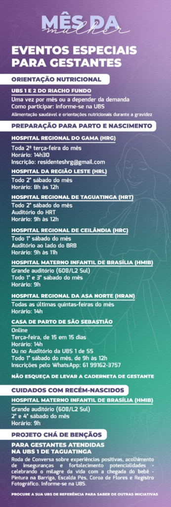 As UBSs 1 e 2 do Riacho Fundo, por sua vez, realizam periodicamente, a depender da demanda, palestras com o tema “Orientação Nutricional para Gestantes”. Mulheres atendidas por essas unidades e seus acompanhantes são convidados pelas equipes de referência a participar dos encontros. Neles, são passadas informações sobre alimentação saudável e orientações nutricionais durante a gravidez. As datas das reuniões são disponibilizadas pela UBS no mês anterior.