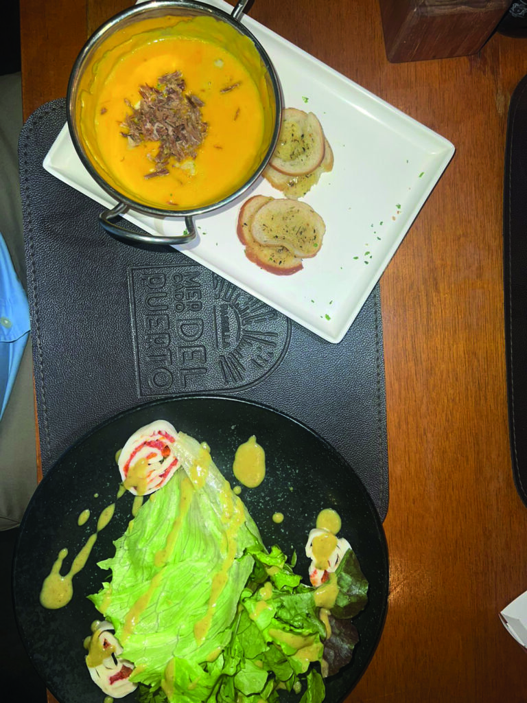 Consomê de abóbora com carne seca e gorgonzola.