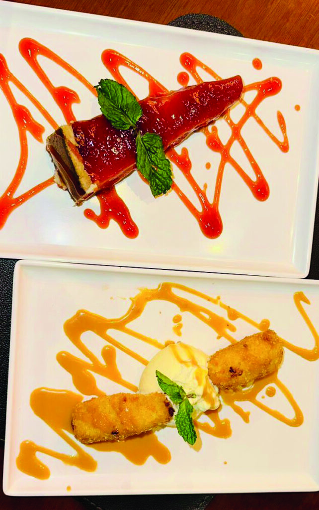 Churros de banana recheados com doce de leite e acompanhados por sorvete de creme.