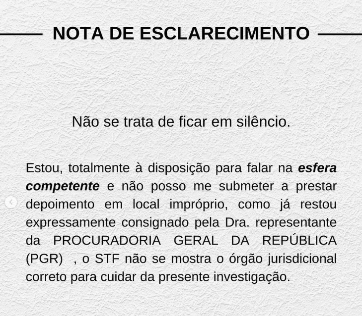 Em suas palavras, Michelle enfatizou que sua escolha não se tratou de recusar a cooperação, afirmando: “Não posso me submeter a prestar depoimento em local impróprio”