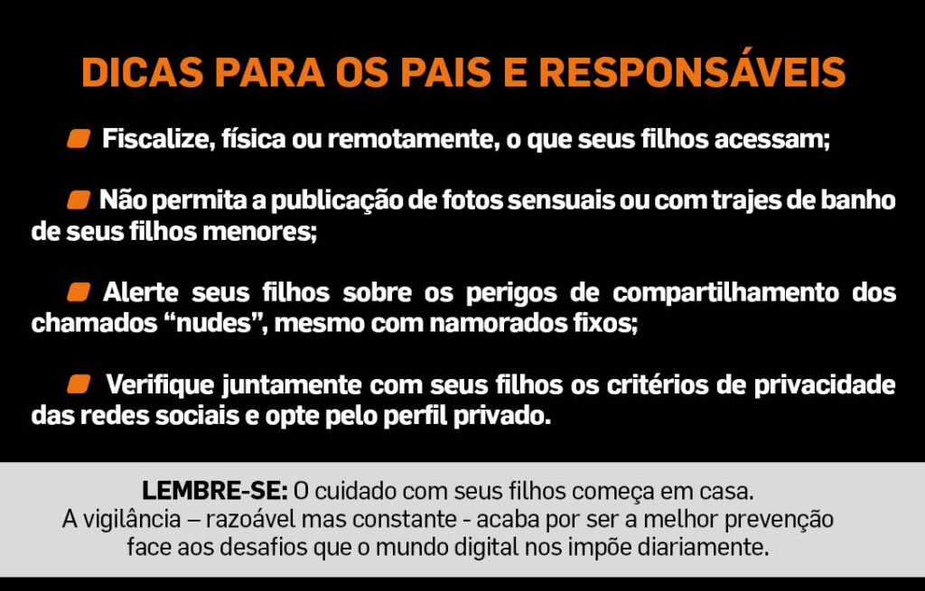 Detectou uso de fotos de seus filhos indevidamente: copie o conteúdo, tire um “print” com o link ou o endereço eletrônico (captura de tela). Entre em contato com o provedor do site o mais rápido possível exigindo a retirada do conteúdo impróprio não autorizado. De preferência por escrito e documentando todo o contato por fotografia ou captura de tela.
