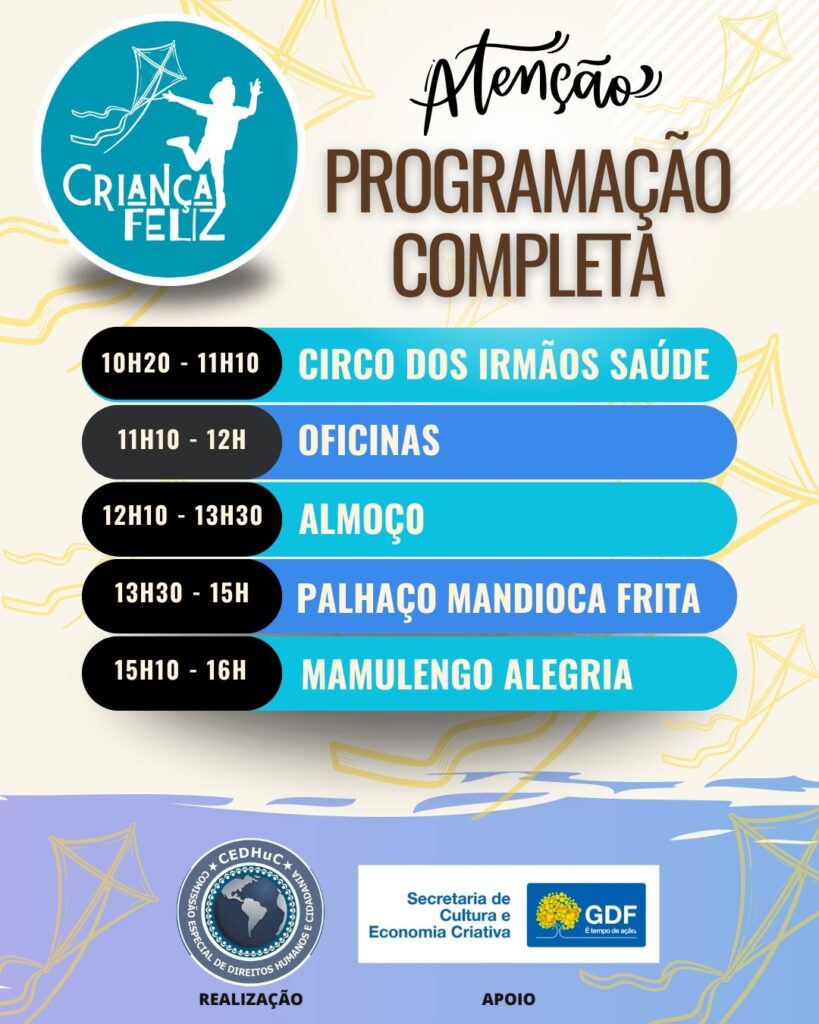 Em comemoração ao mês das crianças, o projeto Criança Feliz leva até a antiga Funarte um dia recheado de diversão para os pequenos. Na próxima quarta-feira, 18, o evento acontece no espaço Eixo Ibero Americano, próximo a Torre de TV, das 10h às 16 horas. O objetivo é promover um momento especial para famílias em situação de vulnerabilidade social.