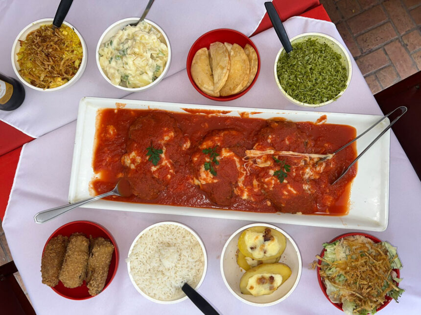 O Miau funciona da seguinte maneira: você escolhe entre opções como filé mignon à parmegiana, frango à parmegiana, picanha, almôndega ou bife de ancho suíno. Após fazer sua escolha, o rodízio inicia sua circulação pelas mesas, apresentando diversas guarnições irresistíveis, como pastel de catupiry e salada Juliana, ideais para uma entrada deliciosa. Enquanto as guarnições circulam pelo salão, você pode saborear arroz branco ou com brócolis, banana à milanesa, farofa de ovos e batata recheada, experimentando um pouco de cada.