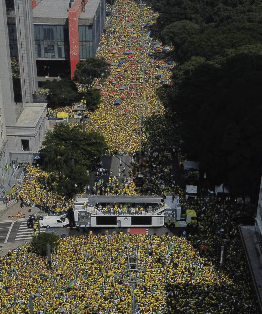 Milhares de brasileiros vestidos com as cores da bandeira nacional inundaram a principal avenida do país neste domingo, em um ato de apoio ao ex-presidente, mesmo diante de sua inelegibilidade. Segundo informações da Polícia Militar, aproximadamente 750 mil pessoas compareceram ao evento, marcando um dos maiores atos na Avenida Paulista, embora ainda aquém do recorde registrado em 2015 durante o impeachment de Dilma Rousseff.