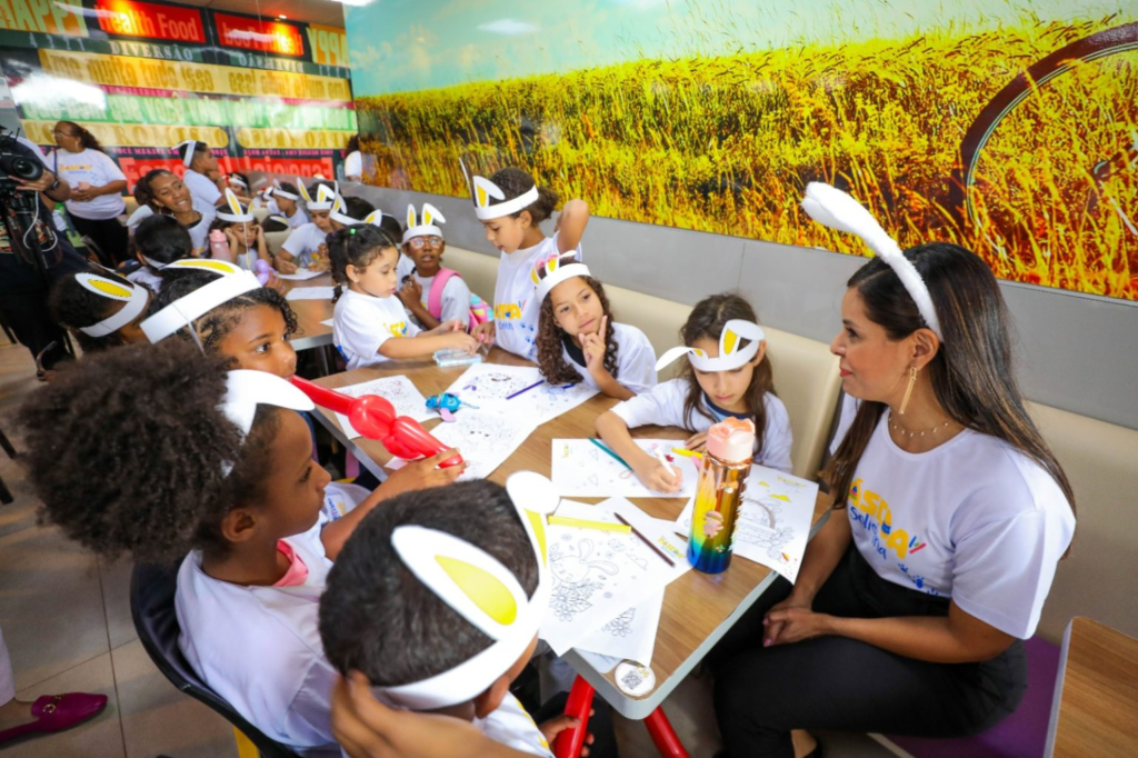 O sorriso contagiante da pequena Maria Helena de Lima, 8 anos, iluminou a unidade do McDonald’s em Taguatinga Centro, na terça-feira (26). Ela participou da 2ª edição da Páscoa Solidária, uma campanha idealizada pela primeira-dama do Distrito Federal, Mayara Noronha Rocha, por meio da Chefia Executiva de Políticas Sociais. Participaram cerca de 70 crianças atendidas pelo Centro Social Formar, em Arniqueira, e o Coletivo da Cidade, na Estrutural.
