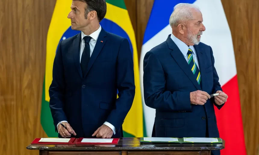 No último dia da visita de Estado ao Brasil, o presidente da França, Emmanuel Macron, foi recebido pelo presidente Luiz Inácio Lula da Silva no Palácio do Planalto, na tarde desta quinta-feira (28). Após uma reunião fechada, ambos fizeram uma declaração à imprensa. Questionado sobre a posição de Macron, contrária ao acordo comercial entre União Europeia e Mercosul, o presidente brasileiro ponderou que a negociação é feita por blocos de países, mas que é direito do francês ter discordância.