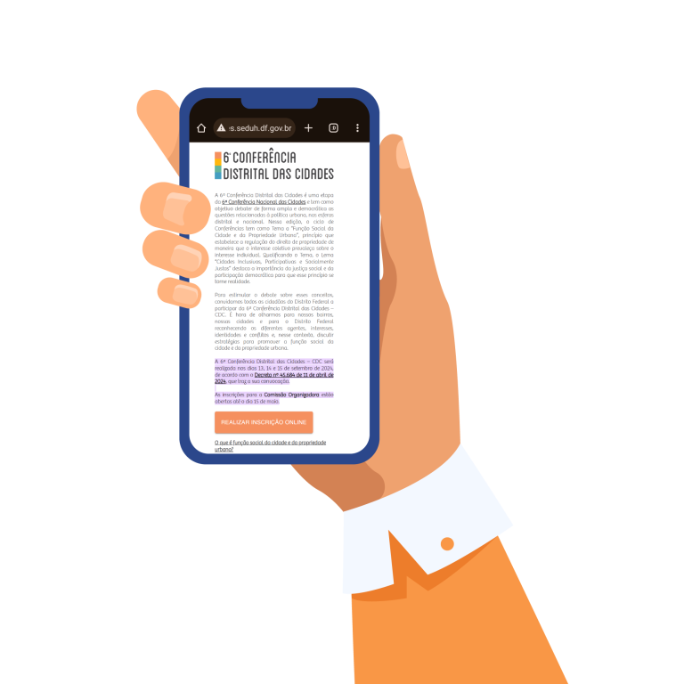 Termina nesta quarta-feira (15) o prazo das inscrições para participar da comissão organizadora da 6ª Conferência Distrital das Cidades (CDC), organizada pela Secretaria de Desenvolvimento Urbano e Habitação (Seduh). Os interessados podem se inscrever tanto por meio virtual quanto presencial.