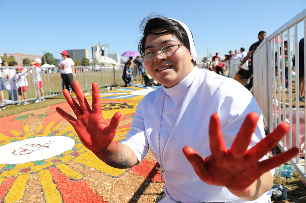 Os tapetes começaram a ser confeccionados às 6h da manhã e é uma tradição de origem portuguesa, trazida para o Brasil na época da colonização. O trabalho artístico remonta a chegada de Jesus Cristo em Jerusalém, quando seguidores cobriram seu caminho com ramos e tapetes. “Essa é uma festa muito importante para a gente, que é a eucaristia. Com o passar do tempo, a igreja foi olhando para essa solenidade com muito amor. A eucaristia é a centralidade da nossa fé. A temática dos tapetes é sempre a eucaristia. A montagem já é uma oração. É um momento de renovação da fé, de agradecer a Deus e reverencia-lo com o nosso trabalho. Para a gente, a eucaristia não é apenas um pão, é Jesus Eucarístico”, explicou Cássia Renata, 31 anos, da Congregação Apóstola do Sagrado Coração de Jesus.