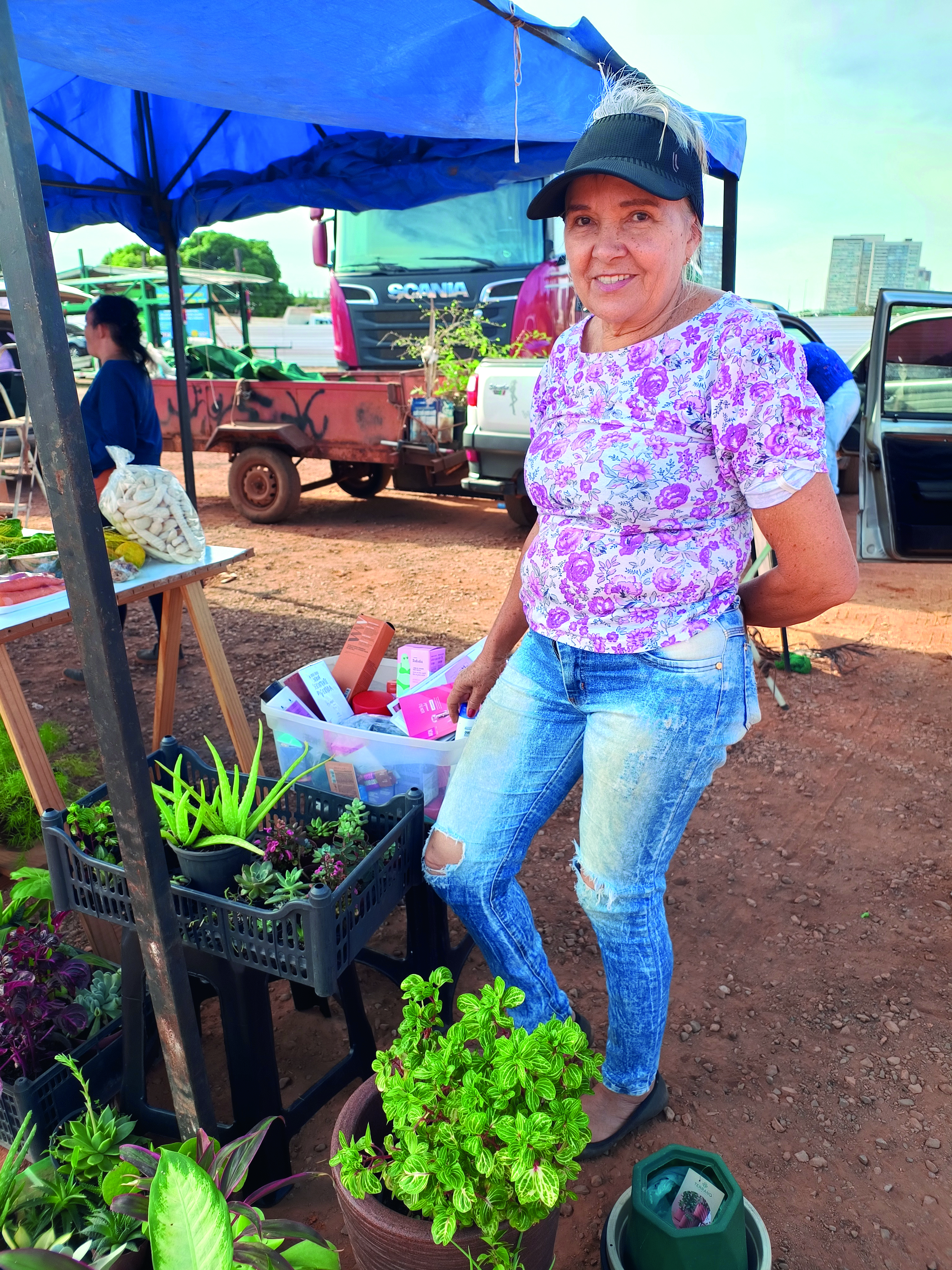 Maria do Carmo, que tem uma barraca de plantas, relata os desafios enfrentados durante a pandemia. “Nós ficamos debaixo de uma árvore lá, só eu e uma amiga, para não perder o ponto. Foram cinco meses difíceis, mas continuamos firmes e retornamos com as mesmas pessoas”, conta Maria que está na feira desde 2019.