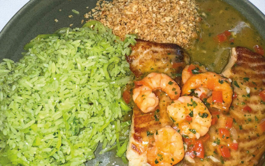 - Tilápia grelhada ao molho de bobó de camarão, com arroz de alho-poró e farofa de panko com mix de castanhas.