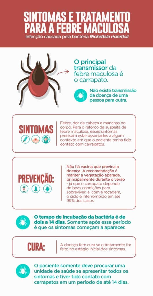 Se apresentar os sintomas aliados ao histórico de contato com carrapato, o paciente deve procurar, o mais rápido possível, qualquer unidade básica de saúde (UBS) da rede. A suspeita de que esteja com febre maculosa já permite que o médico inicie o tratamento com antibiótico antes mesmo da confirmação, tendo em vista as chances de cura no estágio precoce da contaminação. Assim que o médico suspeita de febre maculosa, o tratamento precisa ser iniciado imediatamente, porque é isso que vai definir uma evolução de melhora, evitando complicaçõesFabiano dos Anjos, subsecretário de Vigilância à Saúde