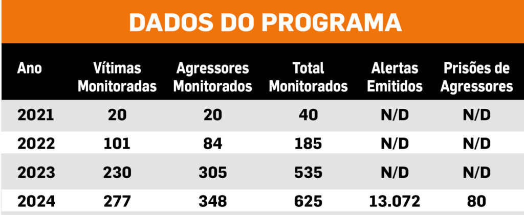 Desde o início do programa, mais de 2,5 mil pessoas foram monitoradas. Em 2024, o serviço alcançou 100% de eficácia, sem registros de agressões físicas contra as vítimas monitoradas. Além disso, 80 agressores foram presos por desrespeitarem as medidas impostas.
