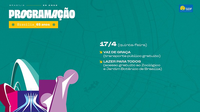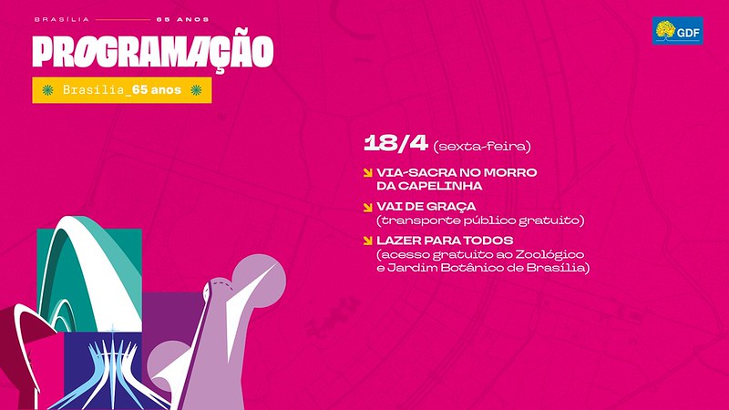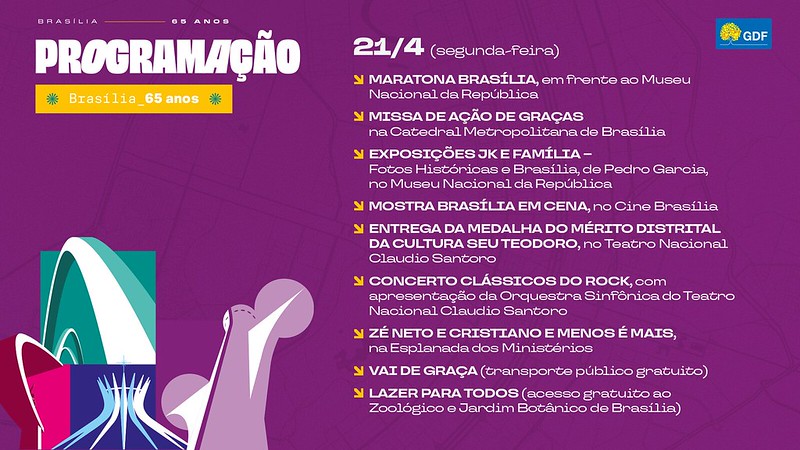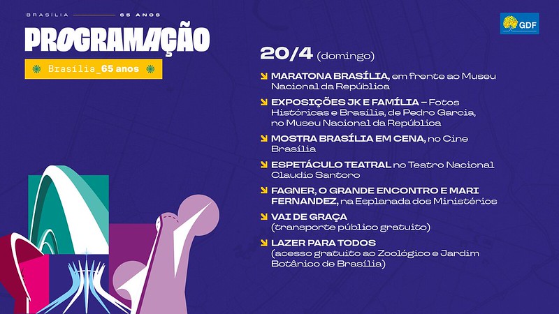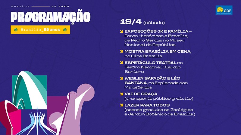 A programação oficial da celebração dos 65 anos de Brasília já está definida. Com o tema “O melhor tempo é agora”, a festa será realizada na área central da capital e contará com três dias de atrações gratuitas, de 19 a 21 de abril. A Esplanada dos Ministérios será o palco principal da comemoração, reunindo artistas de diversos estilos musicais, como axé, forró, gospel, frevo, pagode, piseiro e sertanejo.