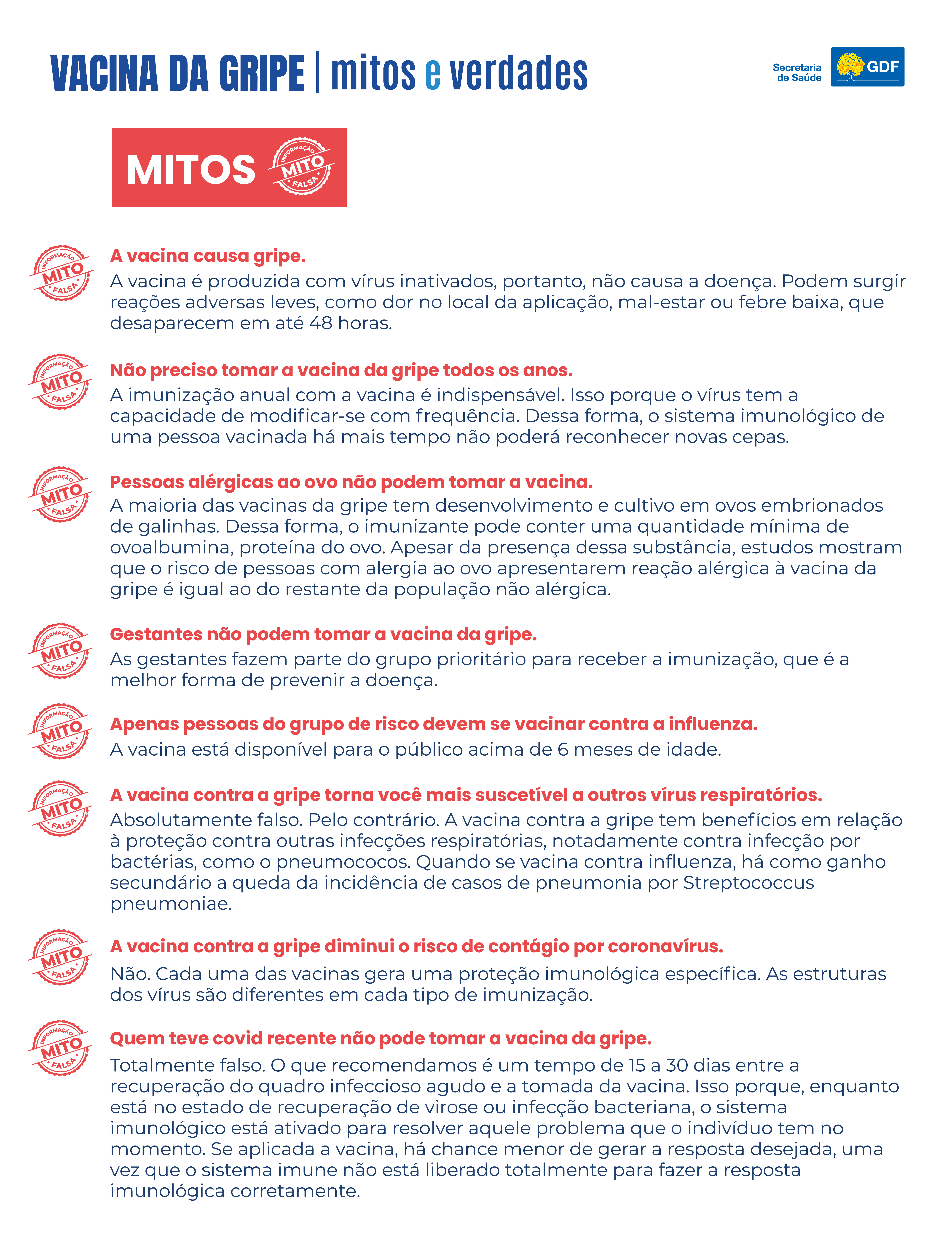 Para esclarecer possíveis dúvidas, a Secretaria de Saúde do DF separou uma lista de mitos e verdades. Confira abaixo: