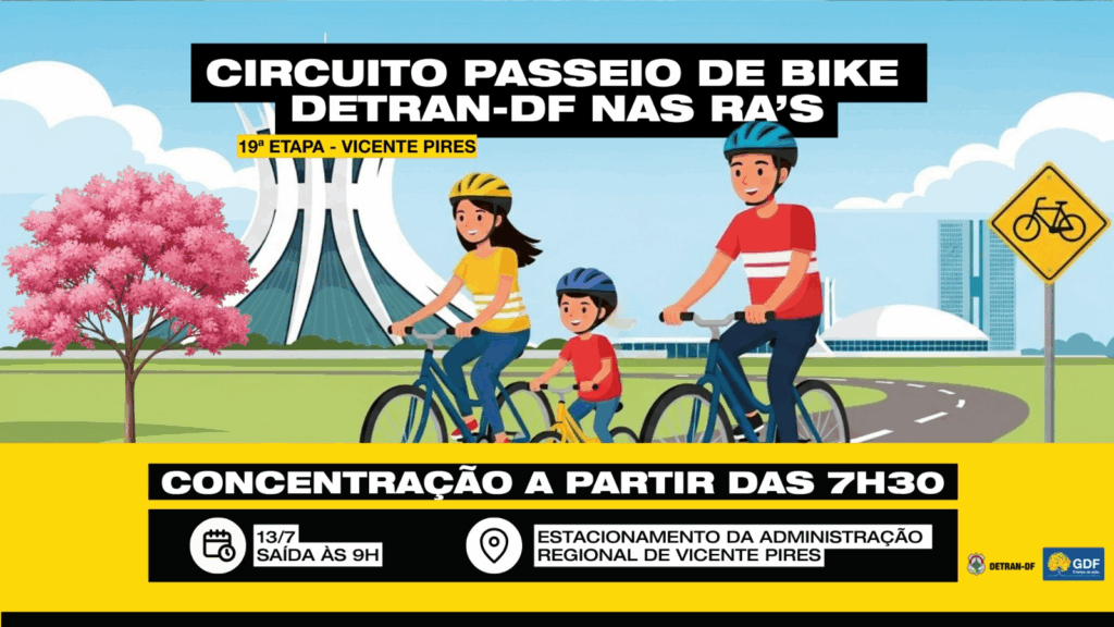 A concentração dos ciclistas será no estacionamento da Administração Regional de Vicente Pires, a partir das 7h30, com saída prevista para as 9h. Durante o evento, serão realizadas palestras educativas e manutenção básica de bicicletas.