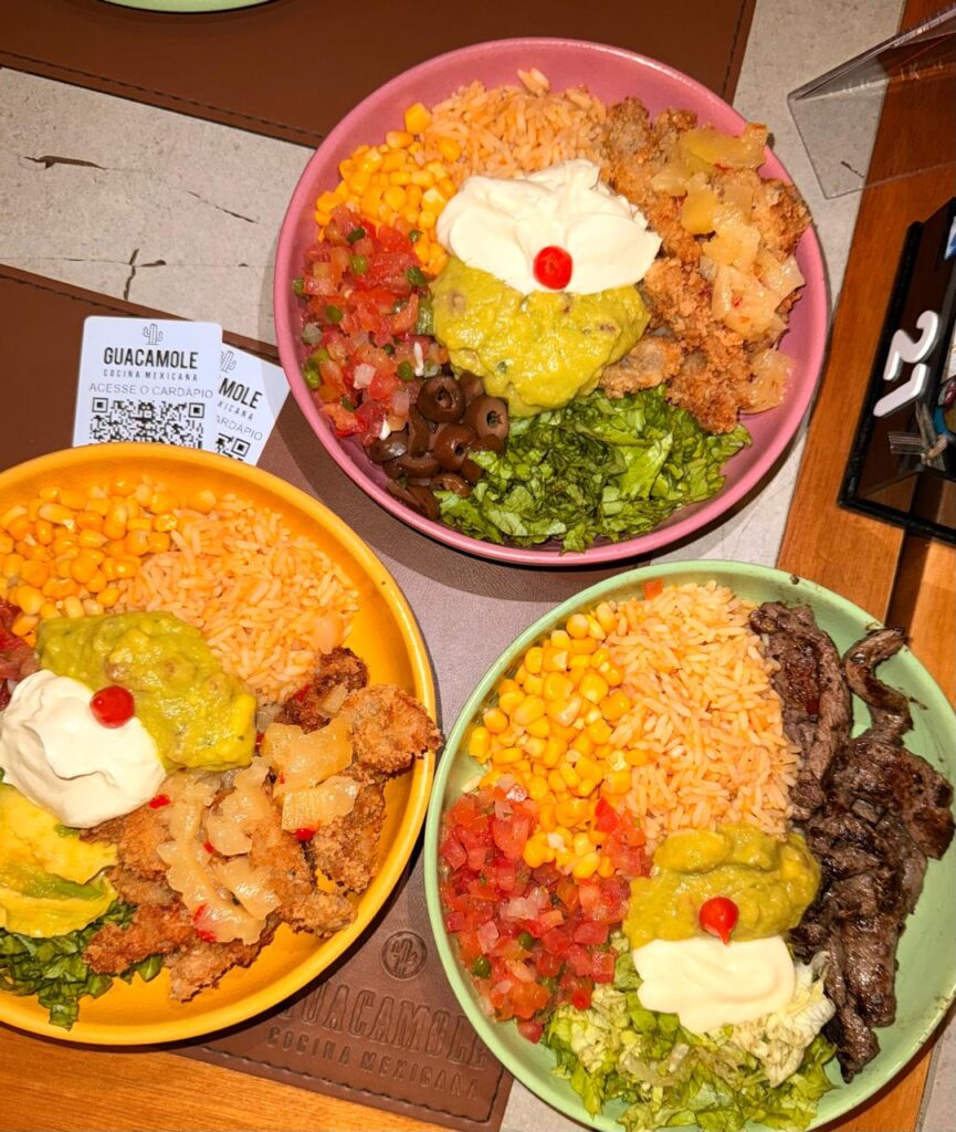 Entre tacos e quesadillas, a grande novidade é o Guaca Bowls. A proposta é simples e certeira: reunir os principais sabores mexicanos em um único prato. Arroz mexicano, pico de gallo, guacamole e opções de proteínas como frango empanado, filé mignon ou frango agridoce compõem combinações que lembram pratos executivos. Os preços começam em R$ 36,90 e incluem a sobremesa tradicional da casa — churros com doce de leite, que encerram a refeição com perfeição.