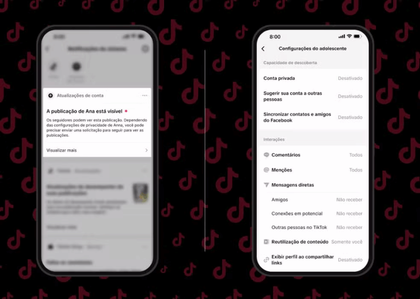 Além das notificações de publicações, os pais poderão acessar as configurações definidas pelos filhos em suas contas. Isso inclui informações como a visibilidade da lista de seguidores, a permissão para download e repostagem de vídeos e os temas escolhidos pelos adolescentes para personalizar o feed de conteúdo.