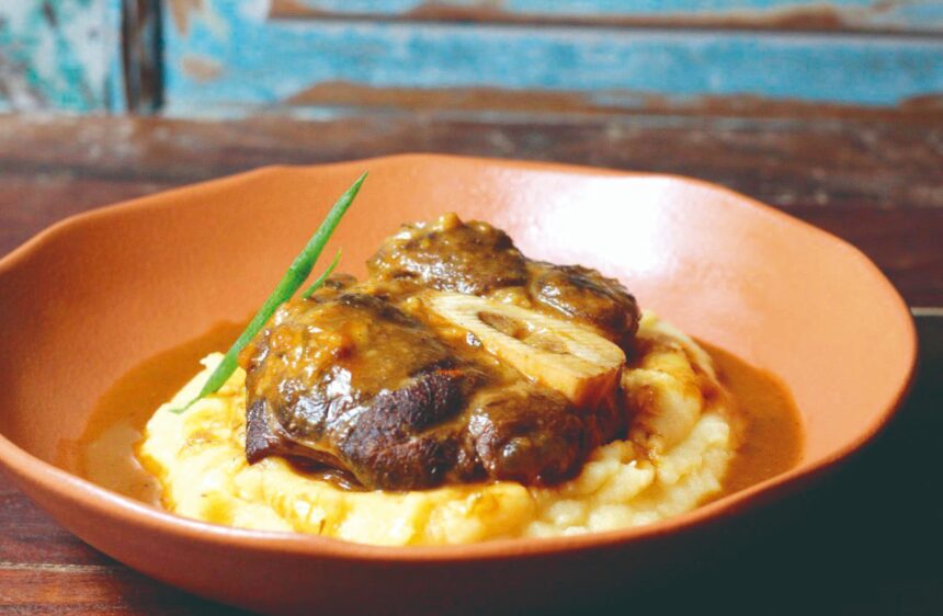 Nos pratos principais, o restaurante apresenta quatro alternativas. Uma delas é o ossobuco braseado, com músculo bovino cozido lentamente até ficar macio, servido com polenta cremosa ao parmesão e gremolata. Outra opção é o medalhão de frango ao molho de ervas, acompanhado de legumes salteados na manteiga de garrafa e purê de mandioquinha.