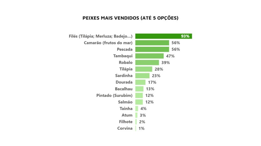 Entre as preferências da temporada estão os filés como os de tilápia, merluza e badejo, citados entre as principais escolhas por 93%. Na sequência, aparecem os camarões e outros frutos do mar (56%), a pescada (56%), o tambaqui (47%) e o robalo (19%).