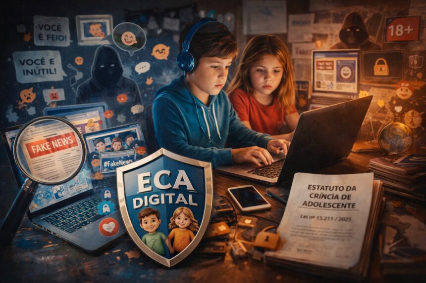 Os riscos a que menores de idade têm sido expostos no espaço digital ampliaram-se enormemente, de maneira veloz e extremamente complexa. Cotidianamente, vemos registrados casos de cyberbullying (cancelamentos, calúnias, ofensas, humilhações, ameaças e exposição indevida de imagens feitas especialmente em redes sociais); exposição a conteúdos inadequados; exploração sexual e coleta abusiva de dados. O ECA Digital vem, portanto, responder a todas essas ações com base no princípio da proteção integral da criança e do adolescente. Atuar para o letramento digital crítico, o combate a Fake News, o convívio social ético nas redes, a observância dos limites a serem aceitos para fazer parte de grupos deve fazer parte desse novo jeito de lidar com o ambiente virtual.